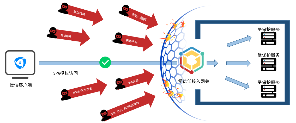 受保護(hù)的服務(wù)對未授權(quán)用戶及設(shè)備完全不可見,無法通過端口掃描發(fā)現(xiàn)服務(wù)。 這些服務(wù)默認(rèn)在互聯(lián)網(wǎng)實(shí)現(xiàn)“隱藏“。嚴(yán)格的終端單包敲門機(jī)制, 確保只有認(rèn)證過的用戶及設(shè)備才能訪問受保護(hù)服務(wù)。