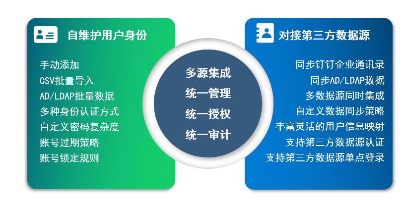 云涌零信任安全管理平臺(tái)既支持主流企業(yè)通訊錄系統(tǒng)的數(shù)據(jù)導(dǎo)入與同步,也支持自建用戶體系。實(shí)現(xiàn)了在一個(gè)平臺(tái)對(duì)企業(yè)人員、部門(mén)以及角色組的統(tǒng)一高效管理。同時(shí)系統(tǒng)提供多種用戶認(rèn)證方式,全方位滿足各種需求場(chǎng)景。