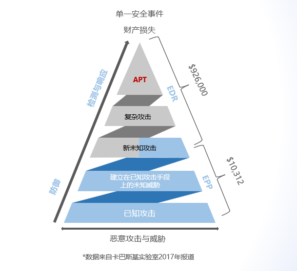 傳統(tǒng)的端點安全防護主要是靠殺毒軟件,通過病毒特征碼匹配進行本地查殺,屬于單機被動防御產(chǎn)品。之后的EPP(端點保護平臺)雖然作為平臺級端點主動防御解決方案并在企業(yè)廣泛應(yīng)用,但該產(chǎn)品還是采用了防御型技術(shù),難以應(yīng)對復(fù)雜攻擊和高級威脅。隨著終端泛在化,未來所有的網(wǎng)絡(luò)節(jié)點都將是終端,端點安全的關(guān)注點,已經(jīng)從單一安全防御轉(zhuǎn)移到更注重威脅發(fā)現(xiàn)和自動化處置能力,對自動化威脅檢測、響應(yīng)、處理、運維能力要求越來越高。在此基礎(chǔ)上,EDR應(yīng)運而生。
