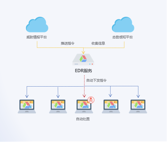 平臺針對安全風險較高的場景(如終端上報了高危安全事件,或觸發(fā)了特殊的安全策略)可以快速響應(yīng)并自動下發(fā)處置措施,及時阻斷已知、未知或高級威脅,全面防護企業(yè)終端安全。