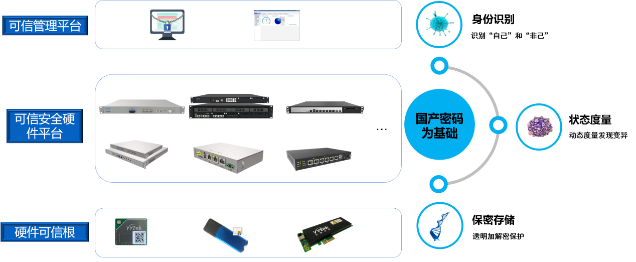 云涌可信計算平臺以可信計算為核心技術,采用“計算+保護”雙體系結(jié)構(gòu),對通用計算部件(包括通用硬件和固件、操作系統(tǒng)、應用軟件及服務)進行度量和控制,為現(xiàn)有系統(tǒng)構(gòu)建可信環(huán)境,實現(xiàn)自主防御,抵御未知木馬、病毒以及0day攻擊。此外,云涌還基于可信計算核心思想和基本架構(gòu),依據(jù)等級保護2.0要求,結(jié)合自身在工控安全領域多年來的軟硬件技術積累,打造出硬件可信根和可信安全硬件平臺等系列產(chǎn)品,全面守護底層到硬件層,乃至應用層的系統(tǒng)安全。