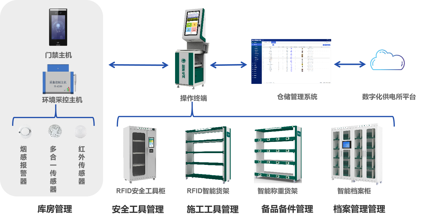 此外為了更好的實現(xiàn)自動控制、智能照明、安全防護(hù)以及數(shù)據(jù)分析,針對供電所“四庫“的室內(nèi)存儲環(huán)境管理,我們配有一整套專門的庫房管理系統(tǒng),以及系統(tǒng)配套的輔助設(shè)備,比如操作終端、RFID通道門和標(biāo)簽等,并結(jié)合使用基于物聯(lián)網(wǎng)、云計算等新技術(shù)構(gòu)建的智能一體化管控平臺,系統(tǒng)管理員不僅可以實現(xiàn)對多個庫房的站點管理,還能獲得更加智能化、多元化的管理解決方案。