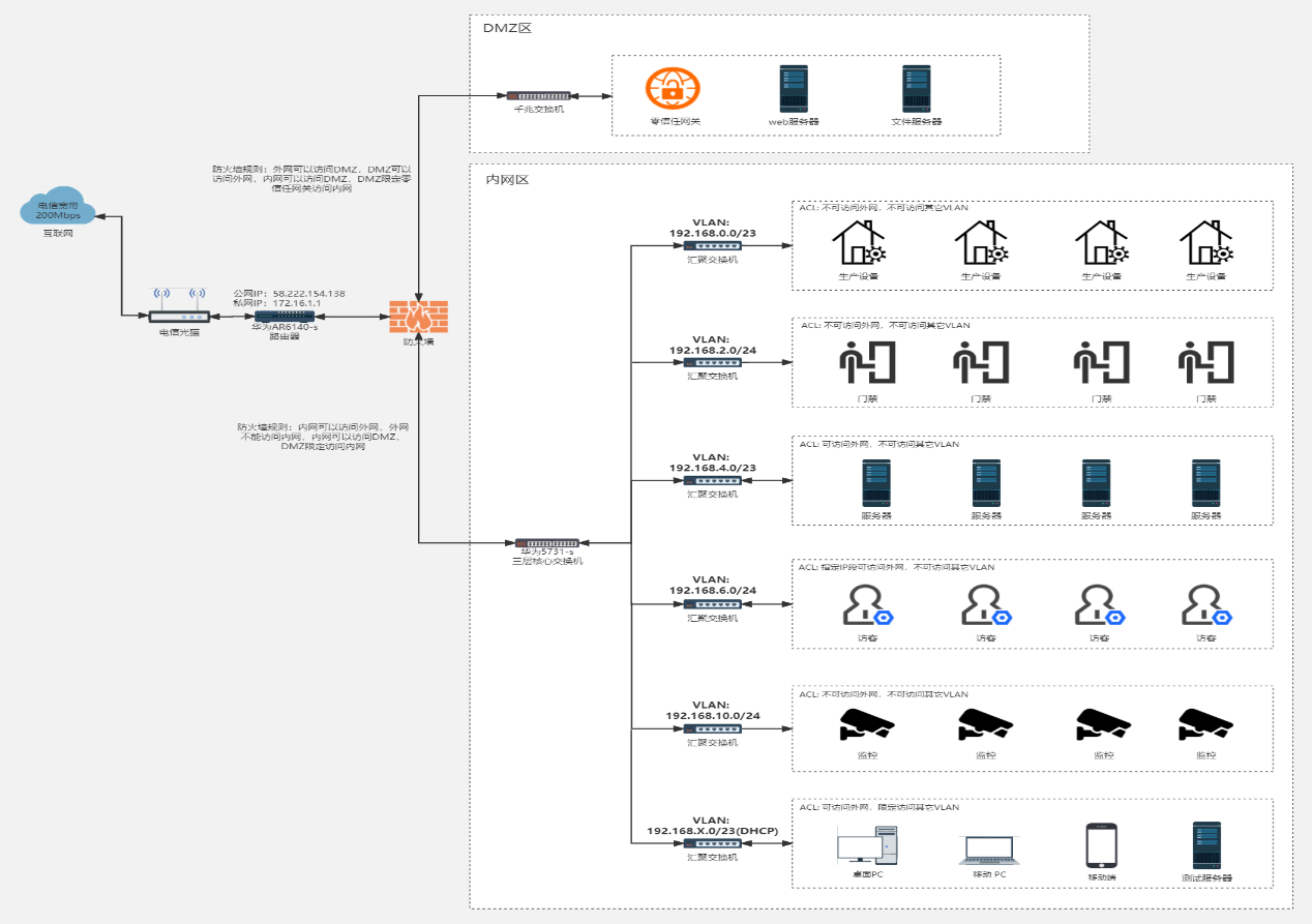 ? ? ? 其次,為了解決內(nèi)網(wǎng)安全隱患,根據(jù)業(yè)務(wù)類型和部門劃分不同的VLAN,各VLAN之間的通過ACL策略進(jìn)行合理的訪問控制。同時(shí)建立DMZ區(qū),DMZ區(qū)用來放置必須公開的服務(wù)器資源(如企業(yè)Web服務(wù)器、文件服務(wù)器、論壇等)和零信任網(wǎng)關(guān),外網(wǎng)、DMZ和內(nèi)網(wǎng)之間通過防火墻進(jìn)行隔離。