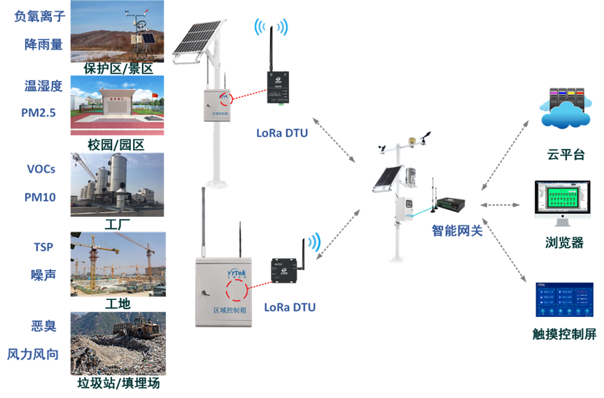 ? ? ? 城市霧霾、工業(yè)廢氣污染、尾氣排放、工地?fù)P塵等,都是國家關(guān)注和治理的對(duì)象,對(duì)于這些污染源頭,我們通過環(huán)境監(jiān)測系統(tǒng),運(yùn)用傳感采集設(shè)備、聯(lián)網(wǎng)傳輸設(shè)備、數(shù)據(jù)顯示設(shè)備、邊緣計(jì)算設(shè)備等,實(shí)現(xiàn)了對(duì)pm2.5、pm10等污染物指數(shù)、溫度、濕度、氣壓、噪音、風(fēng)向、風(fēng)速等環(huán)境參數(shù)的采集,并通過物聯(lián)通訊設(shè)備將這些現(xiàn)場的數(shù)據(jù)傳輸?shù)街悄芫W(wǎng)關(guān)或者遠(yuǎn)程服務(wù)器上,便于管理人員及時(shí)掌握現(xiàn)場監(jiān)測數(shù)據(jù)。針對(duì)蜂窩數(shù)據(jù)信號(hào)比較好的地區(qū),我們可以使用 LTE DTU將數(shù)據(jù)直接透傳至平臺(tái),針對(duì)偏遠(yuǎn)地帶或者信號(hào)受屏蔽地區(qū),我們可以采用LoRa DTU進(jìn)行數(shù)據(jù)采集和中繼傳輸,然后使用智能網(wǎng)關(guān)進(jìn)行數(shù)據(jù)處理和環(huán)保平臺(tái)對(duì)接。