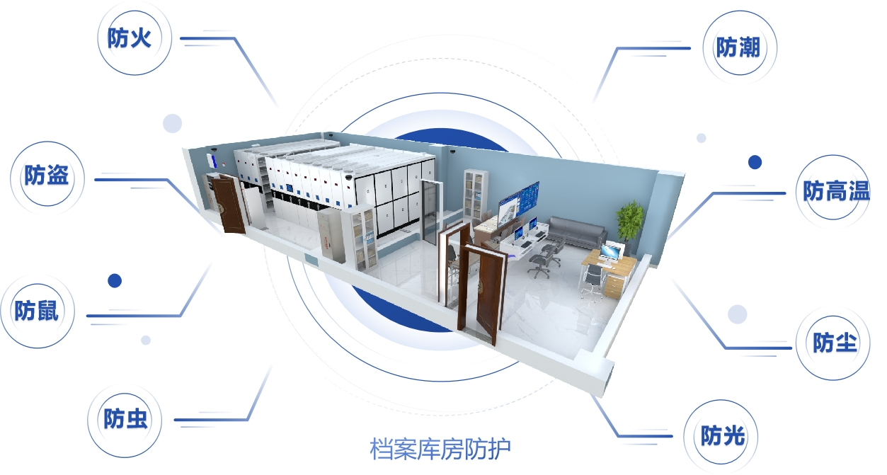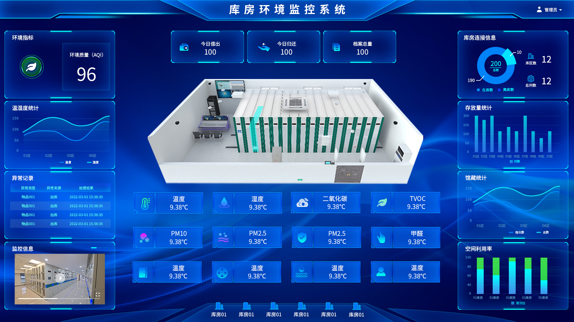 云涌科技智能環(huán)境控制綜合管理系統(tǒng)通過智能設(shè)備采集所有庫房內(nèi)的溫度、濕度、漏水、人員侵入等數(shù)據(jù),并通過自動模式控制空調(diào)、除濕加濕凈化一體機(jī)、電動窗簾、燈光、新風(fēng)機(jī)等智能設(shè)備,達(dá)到自動調(diào)節(jié)溫濕度及空氣凈化的目的,實現(xiàn)了庫房內(nèi)空氣質(zhì)量的智能管理,保護(hù)了檔案本身安全和從業(yè)人員的身體健康。同時接入視頻監(jiān)控系統(tǒng),實時監(jiān)控檔案庫房實時內(nèi)畫面;出入口部署門禁控制設(shè)備,通過指紋、門禁卡、密碼等方式控制人員的進(jìn)入,只有有權(quán)限的管理人員才能進(jìn)入,有效保證檔案實體的安全。